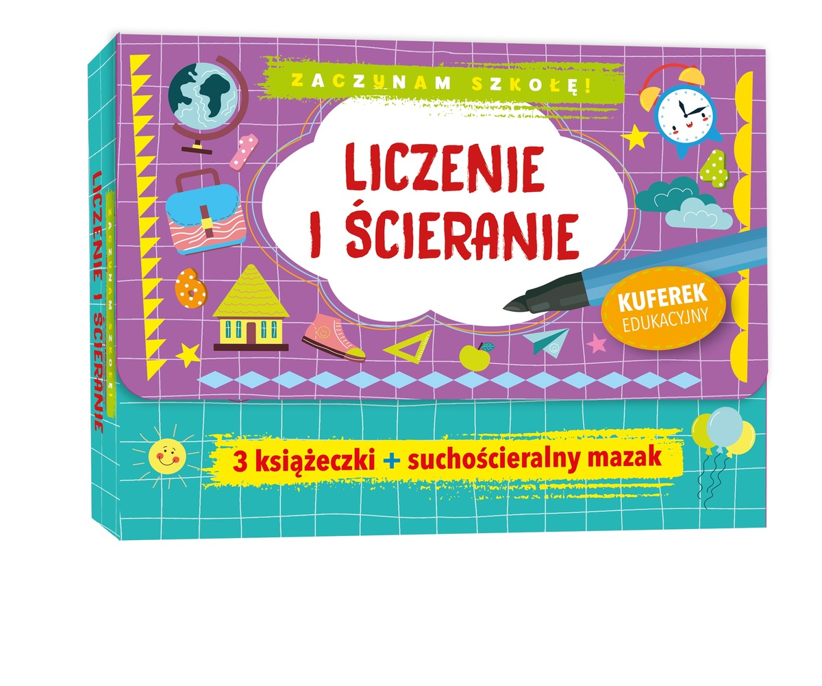 Wspaniały wstęp do nauki liczenia! Ten kolorowy kuferek z suchościeralnym mazakiem będzie doskonałą pomocą edukacyjną dla dzieci rozpoczynających szkołę. W trzech umieszczonych w nim książkach można samodzielnie wykonywać ciekawe zadania, ćwiczyć pisanie cyferek i sumowanie. Dołączony pisak sprawia, że błędy łatwo poprawić.